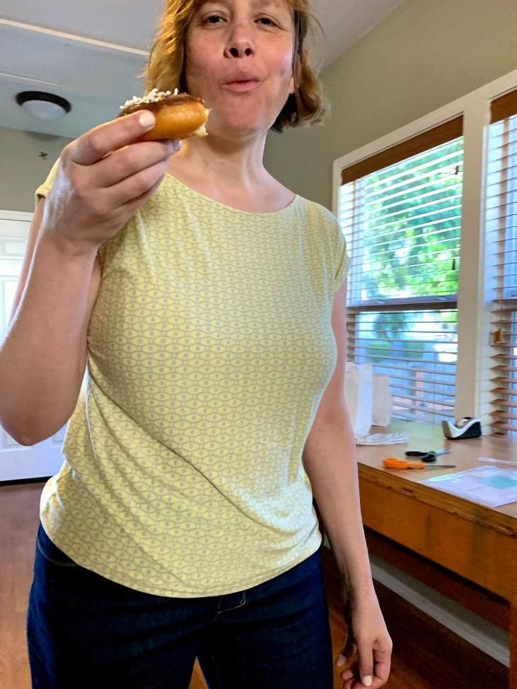 The fabric is a very springy knit from Girl Charlee called “Butter Yellow Gray Mod Dotty Ovals Tencel Spandex Blend Knit Fabric” (what a mouthful!). I got 2 yards for $8.76 and used less than half of it here. This means I had money leftover to hit my local donut shop, Coco Donuts, as soon as I was done sewing.