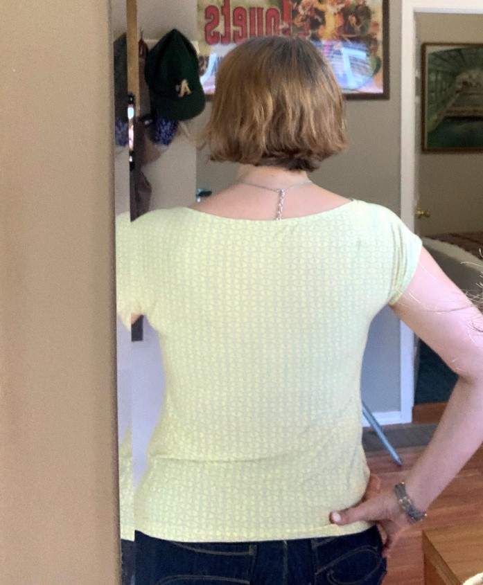 One other issue I wanted to fix with this Edie was, in my first one, the neck gaped open a bit. I wanted the neckline to sit on my collarbones. I found this excellent blog post on Phat Chick Designs that had a quick fix: Slice a triangular piece out of the center front that was a 1/2″ at the top and narrowed to nothing at the bottom. This worked and removed the extra fabric around the neck that was dropping open.