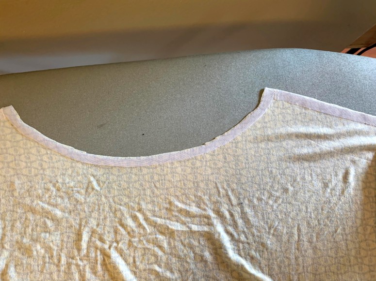 The Sew Over It pattern instructions for the Edie call for using a stay tape around the neckline. I couldn’t find anything like what they described in the U.S. (I did find it in Australia) so I just cut strips of Pellon EZ-Knit interfacing and ironed that on around the neckline. The neckline did not stretch out at all and I saved some international shipping.
