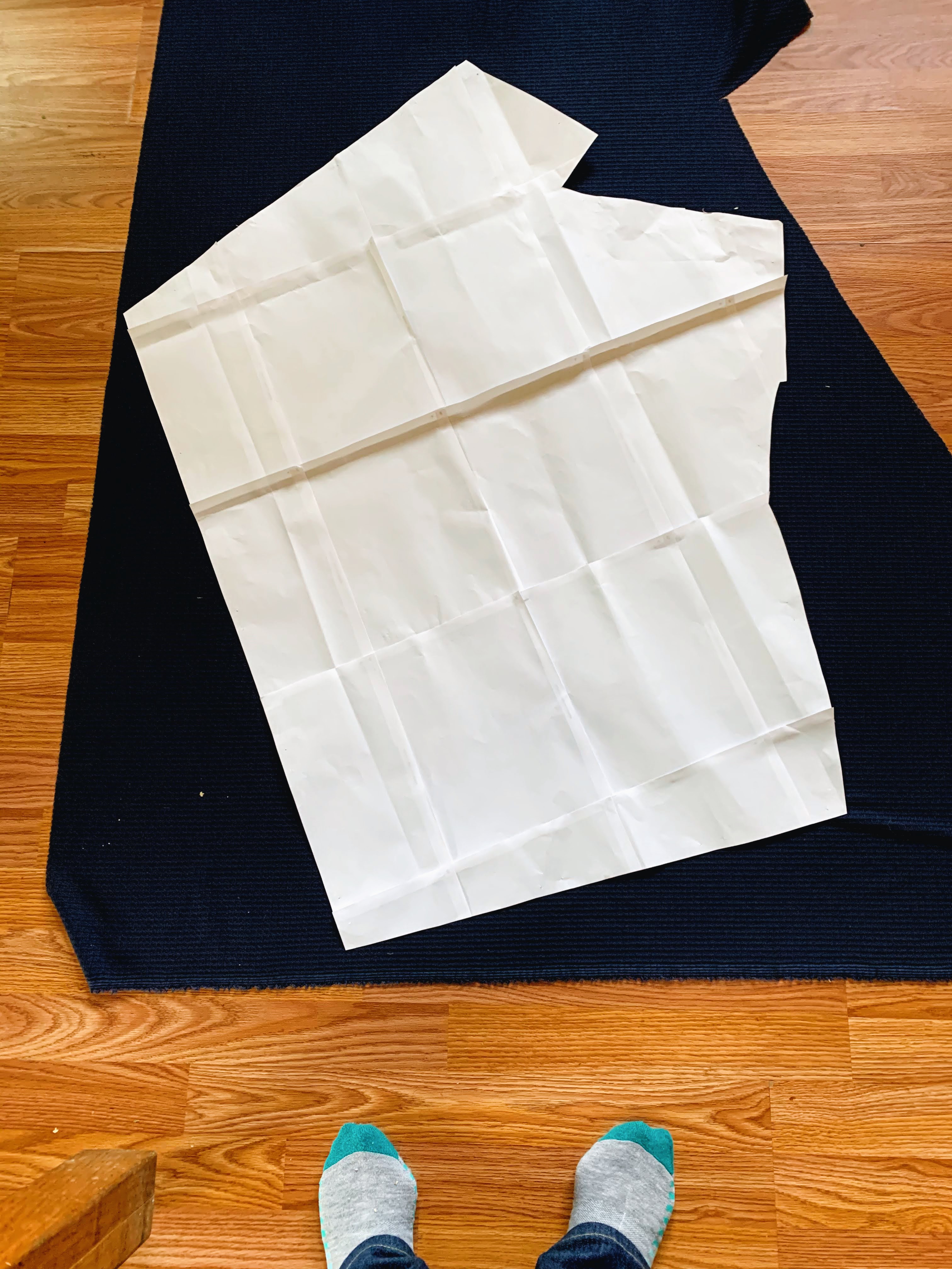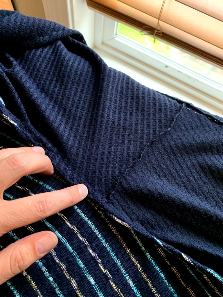 Never one to walk away from a project at the first sign of difficulty (though half the time maybe I should), I searched the internet for something similar, as the original fabric was sold out at Califabrics. The closest thing to it was a navy blue waffle fabric at Mood. I got the last of that too! My two front pieces just fit on the 2 yards from Mood and I was able to continue. The two navy blues are not the exact shades, but they’re pretty close. In these photos, the fabric looks very purple, but I assure you it is navy blue.