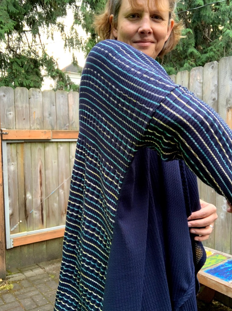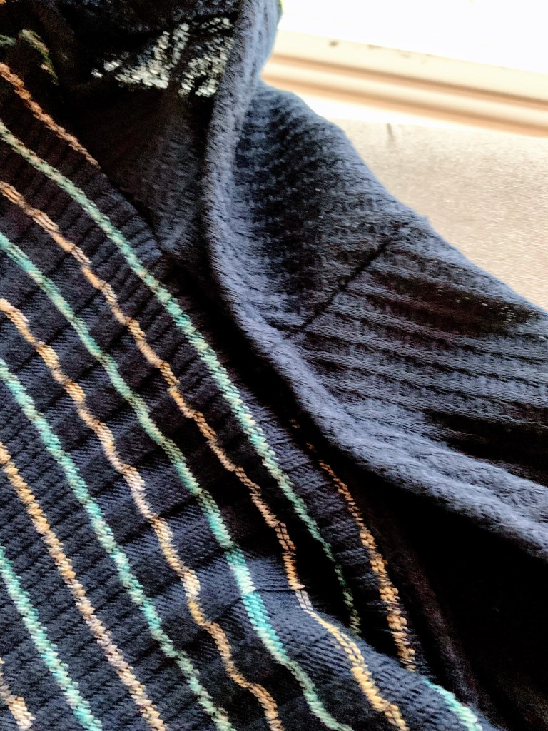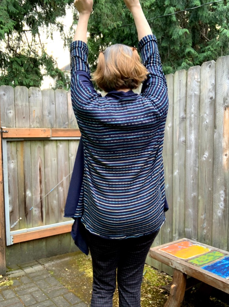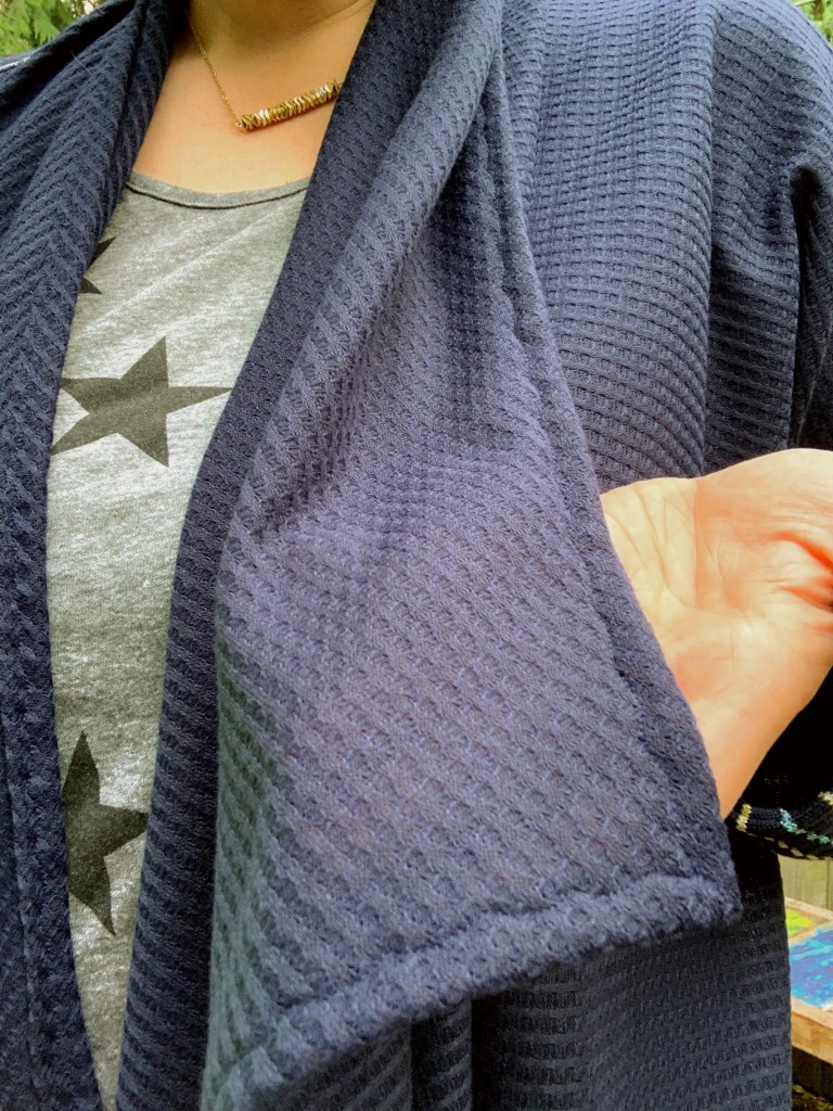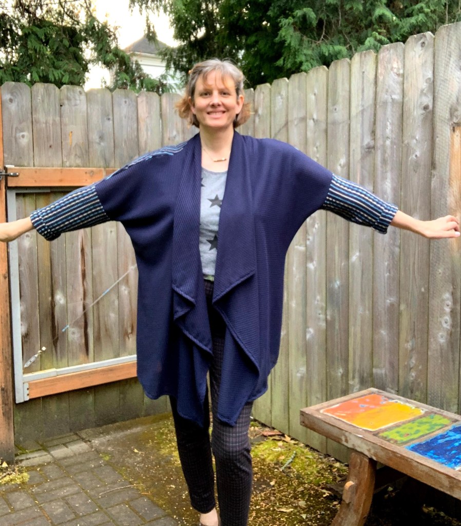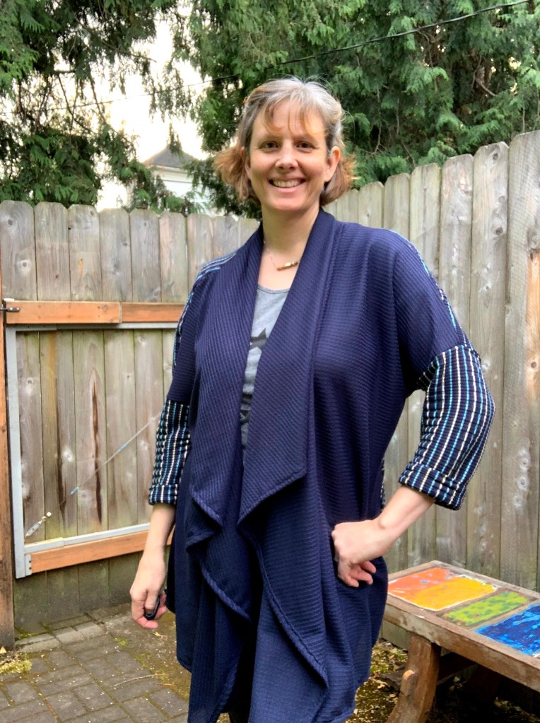 For me this is the perfect cardigan — something that looks like it might swallow me up whole. I had not intended to use two different fabrics. As you might have read in my Kathryn Top post, I had purchased this two-tone blue and yellow stripe fabric from Califabrics, but ran out of fabric after cutting the back and sleeves. This was due to a misreading of the pattern, where I saw the fabric layout and it said “1-1/2 yards” over the top. As you might guess, this was half the layout for only the back and sleeves. A second layout drawing was of the two front pieces on a separate 2-yard piece of fabric.