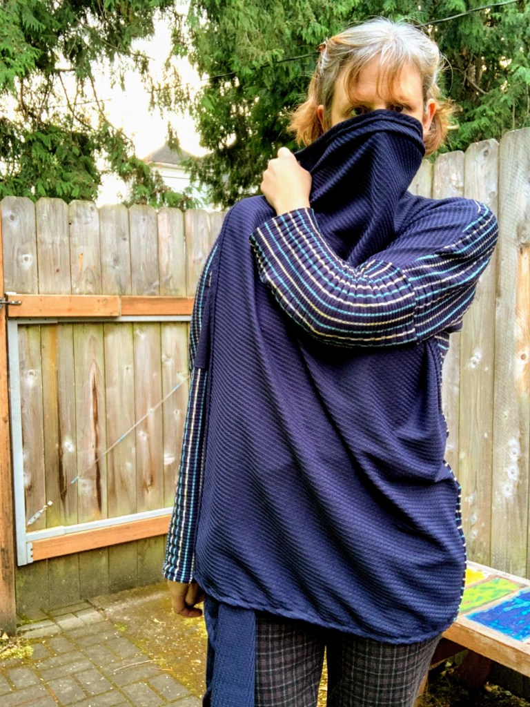 This will be the topper in my Back to School module, and in my #WFHModuleSewalong entry. The WFH Module Sewalong is an Instagram challenge where you sew (or sew + thrift) six pieces that all coordinate together. My entry is due October 30 and I now have only one piece left, which will be a pair of pants. I’ve changed my plans from the Mountain View Pull-on Jeans to the newly released Pattern Scout Nellie Joggers (purchased in her recent release sale). Fabric is due to arrive tomorrow!