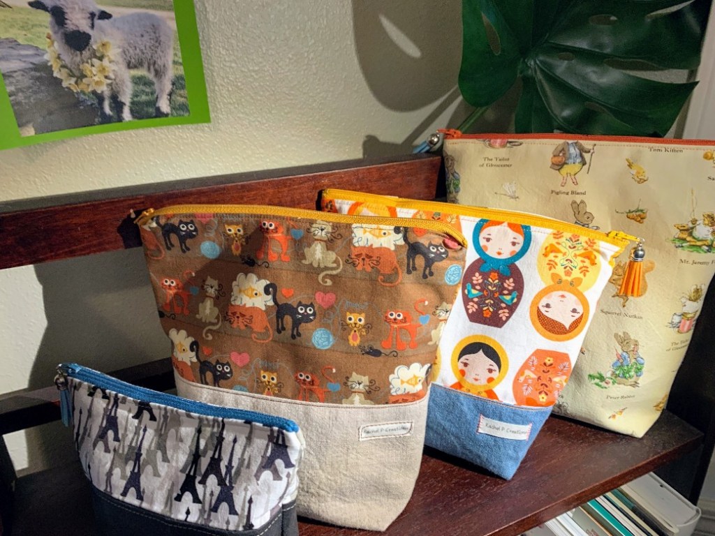 These are four bags I’ve made this year. I made them all with a pattern I bought on Etsy from Kandou Crafts, called Zipper Pouch in Five Sizes. It’s a great little pattern that I was able to customize quite a few ways. The pattern has sizing for a 6, 7, 8, 9 and 10″ zipper. The math for an 11 or 12″ zipper could be easily determined if you wanted to make an even bigger bag.