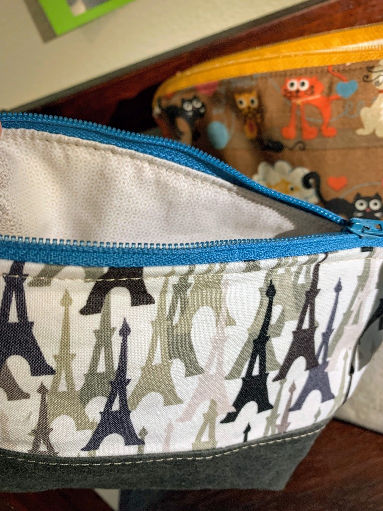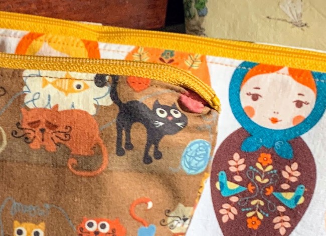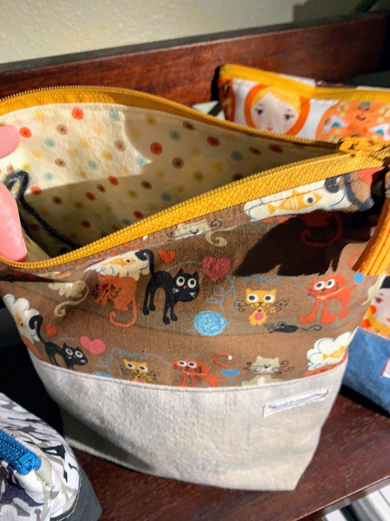 I made one misstep on this bag. I decided to disobey the instructions and topstitch the outer fabric and the lining at the same time, because I wanted the lining to lay down flatter than it did on my first bag. A problem arises when you sew close to the zipper all the way to both ends. You can’t turn the ends inside-out! This resulted in an ugly, puckered end. You can see the black cat in the fabric looking at it in horror.