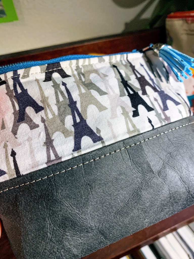 My third bag is completely different. The base of this bag is not fabric but paper. It’s called washable paper and I bought it by accident at Michael’s, thinking it was construction paper. When I read the label at home, I Googled it and found it’s often used in bags as a vegan leather. I had to try this! I ran it through the washing machine and then cut it for the Small (7″ zipper) bag.
