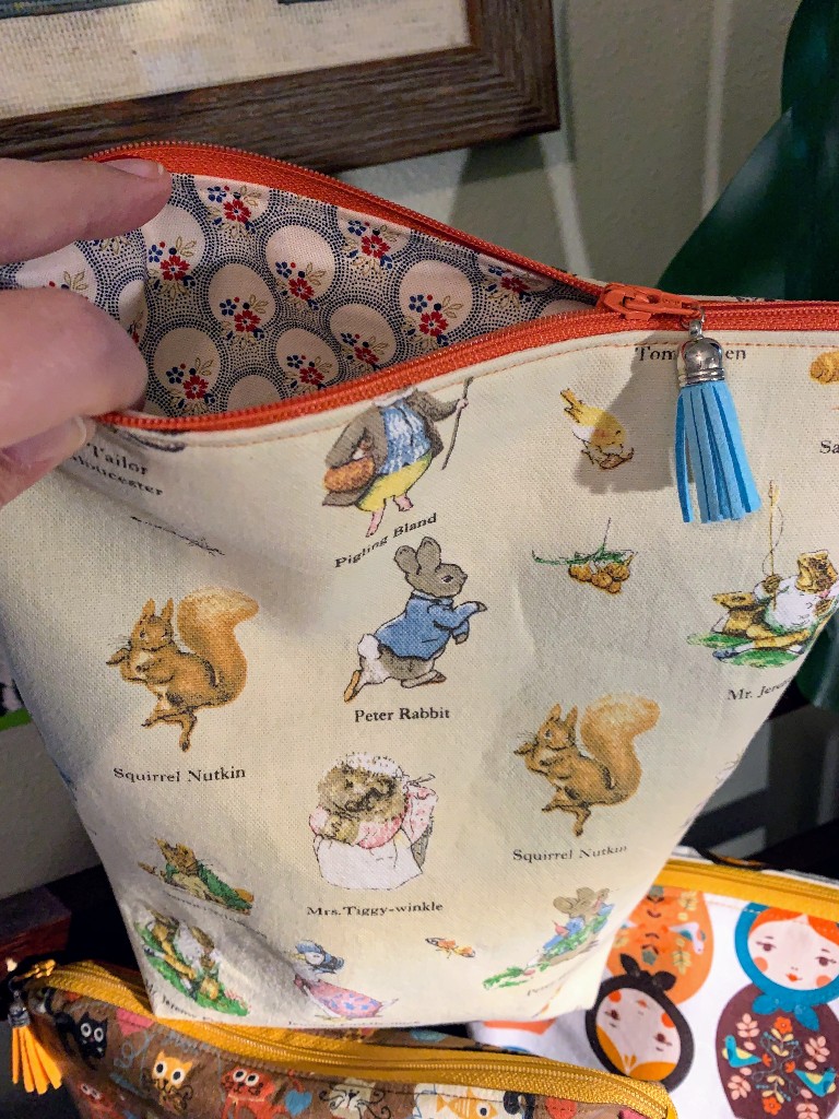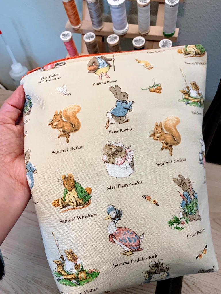 Last but certainly not least is my Peter Rabbit bag. I did not do a base on this bag at all because I wanted to highlight a special fabric. This was a tea towel I purchased at Beatrix Potter’s house in the Lake District, which I visited in July 2012. I wasn’t sure I wanted to cut it up, but I will see it more often and it will get much more love as a bag than as a tea towel.