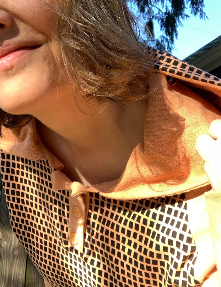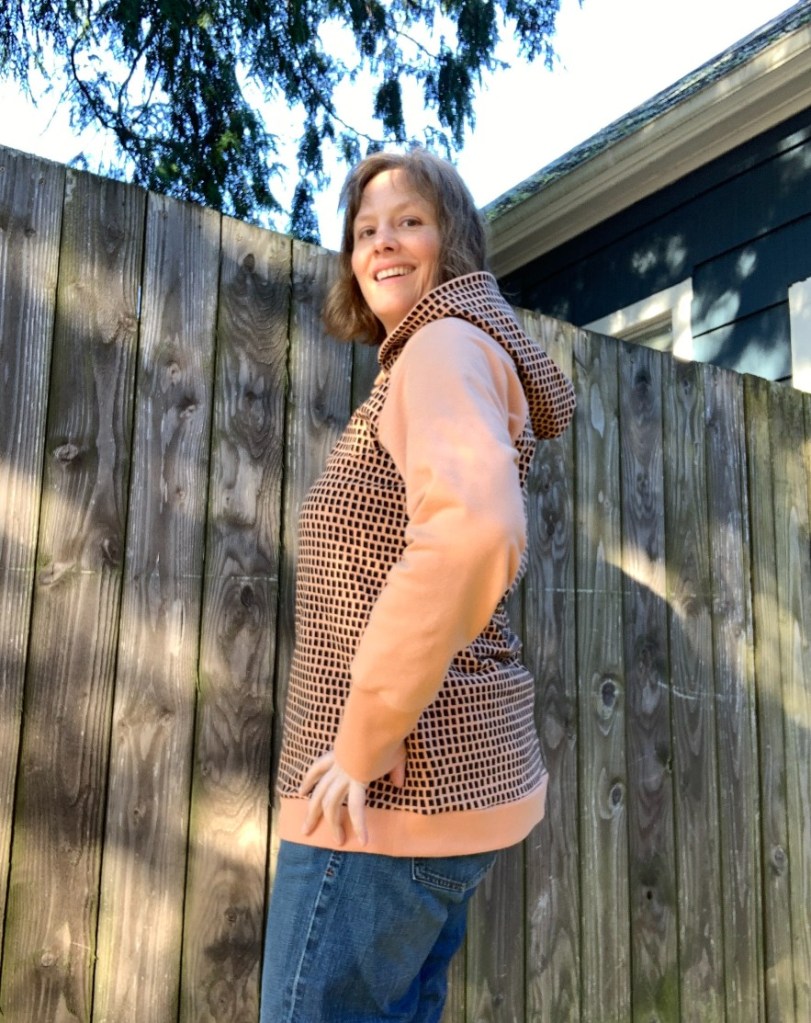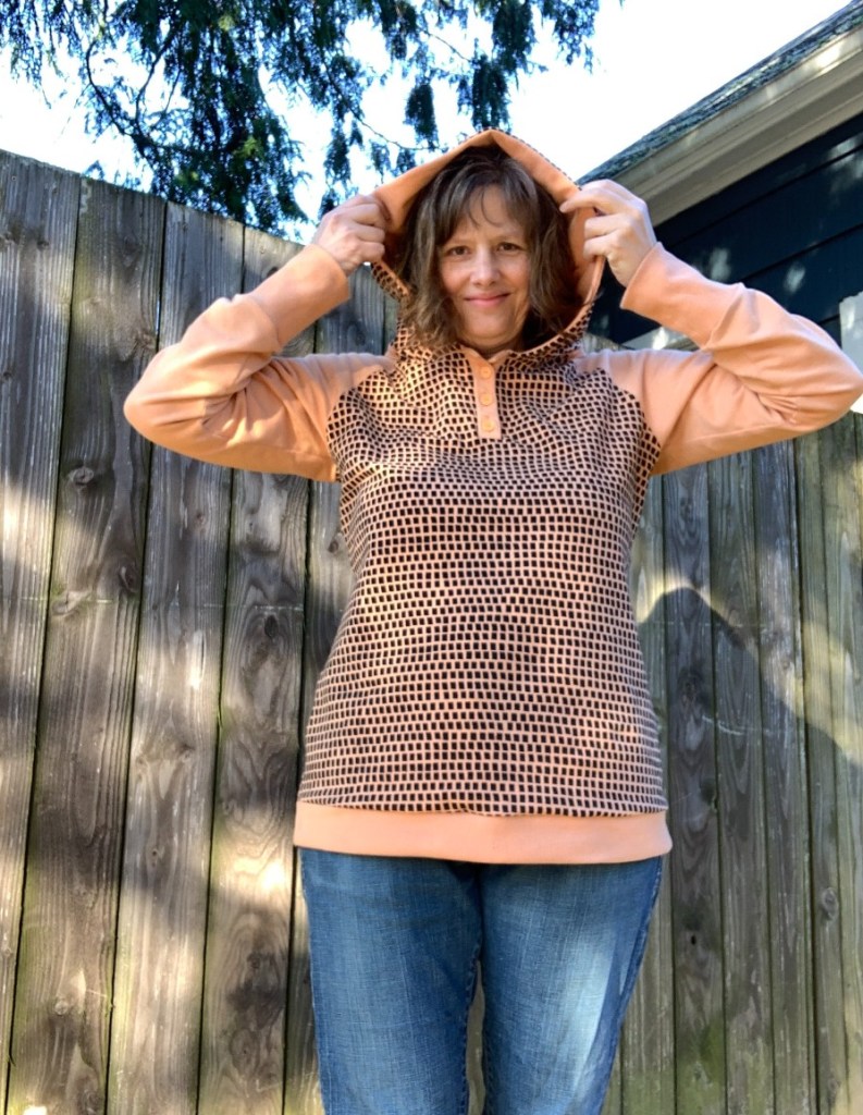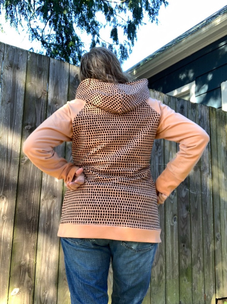 I’ve done a couple hoods in the past, so that was no problem. I had a hard time deciding if I wanted the hood in the pattern or just plain peach. Eric voted for the patterned hood, so I went with that. The hood is lined — which I love. I actually added a hood lining that wasn’t in the pattern for my last sweatshirt, the Castillo Cardigan. For this one, I turned the french terry inside-out and used the terrycloth side for the lining. The hood is now perfect to wear if my hair’s wet!