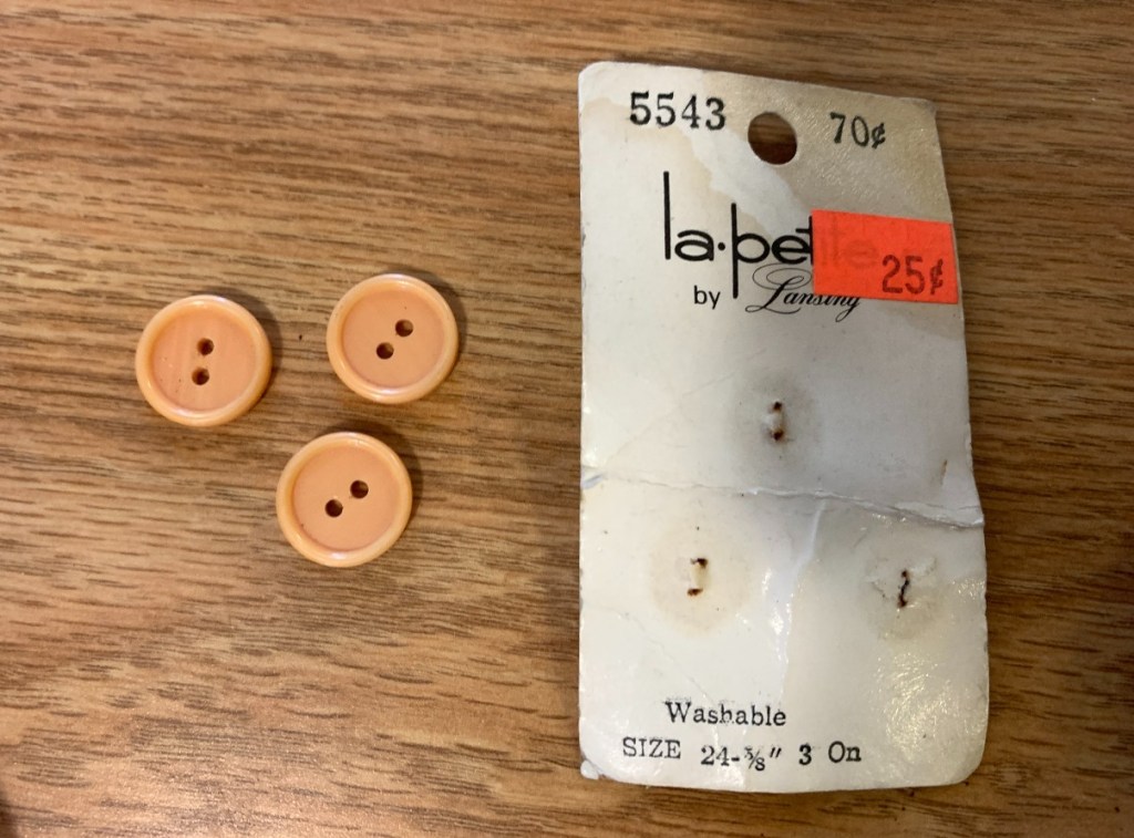 I found it amusing that these buttons are at least 40 years old, and their price had depreciated from 70 cents new to 25 cents at a thrift store in 2021.