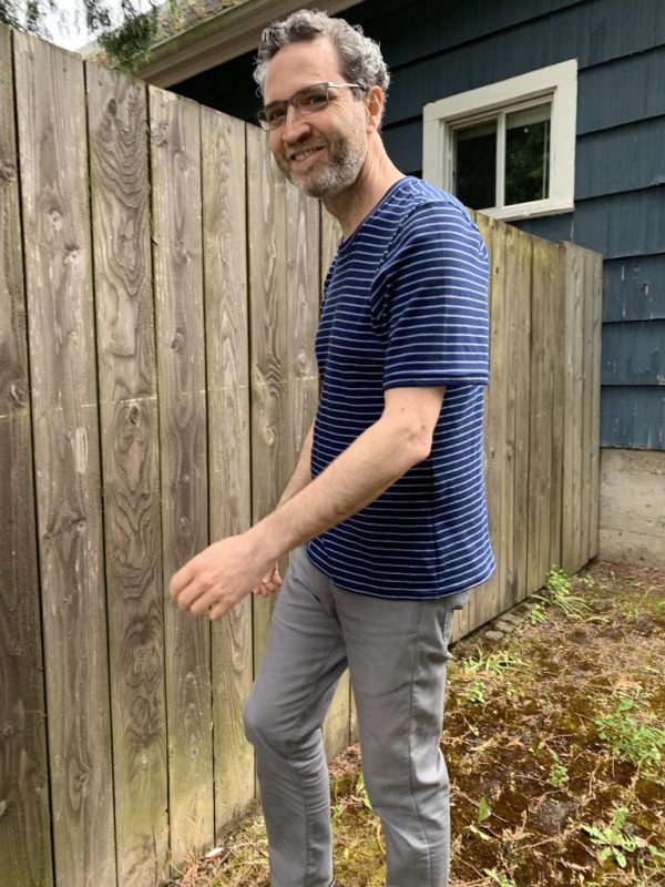 Yes, that’s my husband, Eric, and not me. Here’s how this happened: I had made a sample of the Men’s ABB Tee (I didn’t know DIBY Club had a Women’s ABB Tee — but they do!) to test my customizations to the pattern pieces. Eric’s birthday was coming up, so I asked him to try on the sample. He kindly obliged.