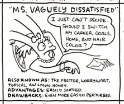 Only two things could be improved in this make, and they’re a bit frustrating because I’m not sure how I would like them improved. I’m just vaguely dissatisfied with them. Which reminds me of my favorite of Matt Groening’s “9 Types of Girlfriends”: